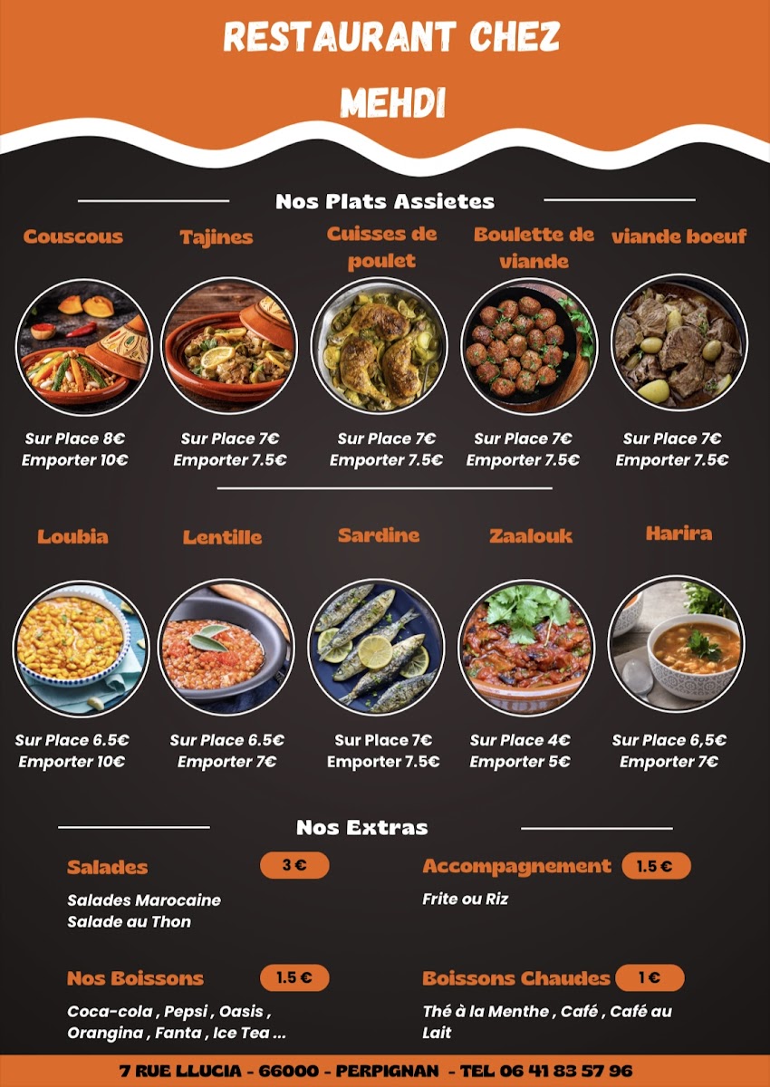 Welcome to Restaurant Chez Mehdi, a hidden gem nestled in the heart of Perpignan. This Moroccan restaurant, located at 7 Rue François Xavier Antoine de Llucia, offers guests an authentic culinary journey that evokes the warmth of home. The menu showcases traditional dishes crafted with care, from the richly flavored couscous to the aromatic tajines, all prepared under the watchful eye of a passionate mother-chef and her attentive son.